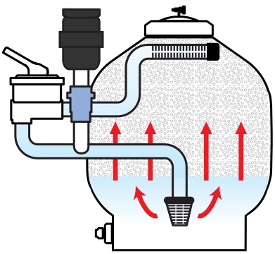 Při nadměrném zatížení je nutné filtr propláchnout a odstranit nečistoty. Nejprve se za chodu čerpadla na pár vteřin otevře kulový ventil na dně filtrační nádoby, čímž dojde k odkalení nejhrubších nečistot. Potom se pomocí silného kompresoru, který je součástí dodávky promíchá obsah filtrace, čímž dojde k rozrušení kalů a pročištění médií. Čerpadlo je vypnuto. Poté se pomocí šesticestného ventilu obrátí tok vody ve filtru ze shora dolů, čímž dojde k propláchnutí médií a vypláchnutí kalů z filtrační nádoby. Čerpadlo je zapnuto. Tento cyklus se opakuje až do doby než z filtru poteče čistá voda. Nakonec se ventil přepne do výchozí pozice a pokračuje filtrace. Výhodné je používat čerpadla s duálním výkonem, která dokážou na vyšší výkon média lépe propláchnout.