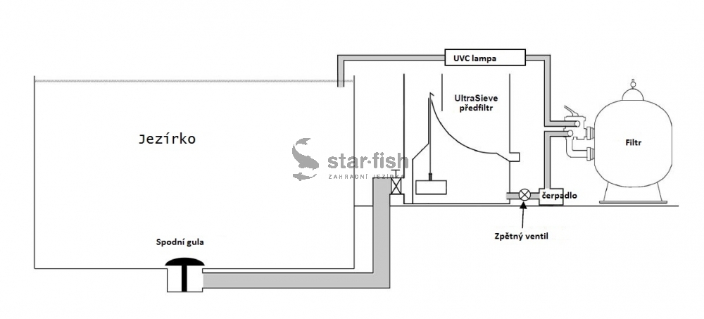 Voda je do filtru přiváděna přes šesticestný ventil. Vytéká u dna filtru speciální tryskou, která vodu roztočí, čímž dojde k usazování nejhrubších nečistot na dně filtrační nádoby. Potom voda prostupuje pohyblivým ložem filtračních perliček, které se koncentrují v horní části filtru. Jsou lehčí než voda, proto vytvoří v horní části filtru vysoce efektivní filtrační vrstvu. Nad touto vrstvou je sběrný kolektor, který odvádí přefiltrovanou vodu přes šesticestný ventil zpět do jezírka nebo odchovné nádrže.
