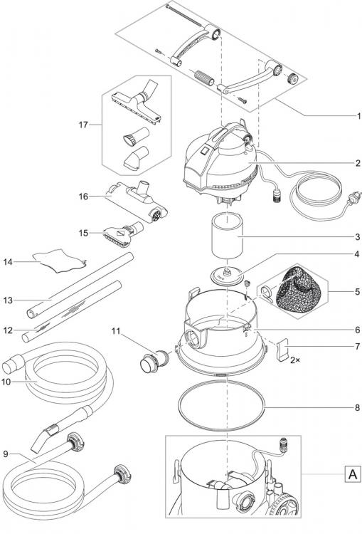 - K vysavači náleží i bohaté příslušenství. Sací potrubí lze nahradit sací hadicí umístěnou na teleskopické tyči. Výtokovou hadici lze prodloužit o dalších 10 m.